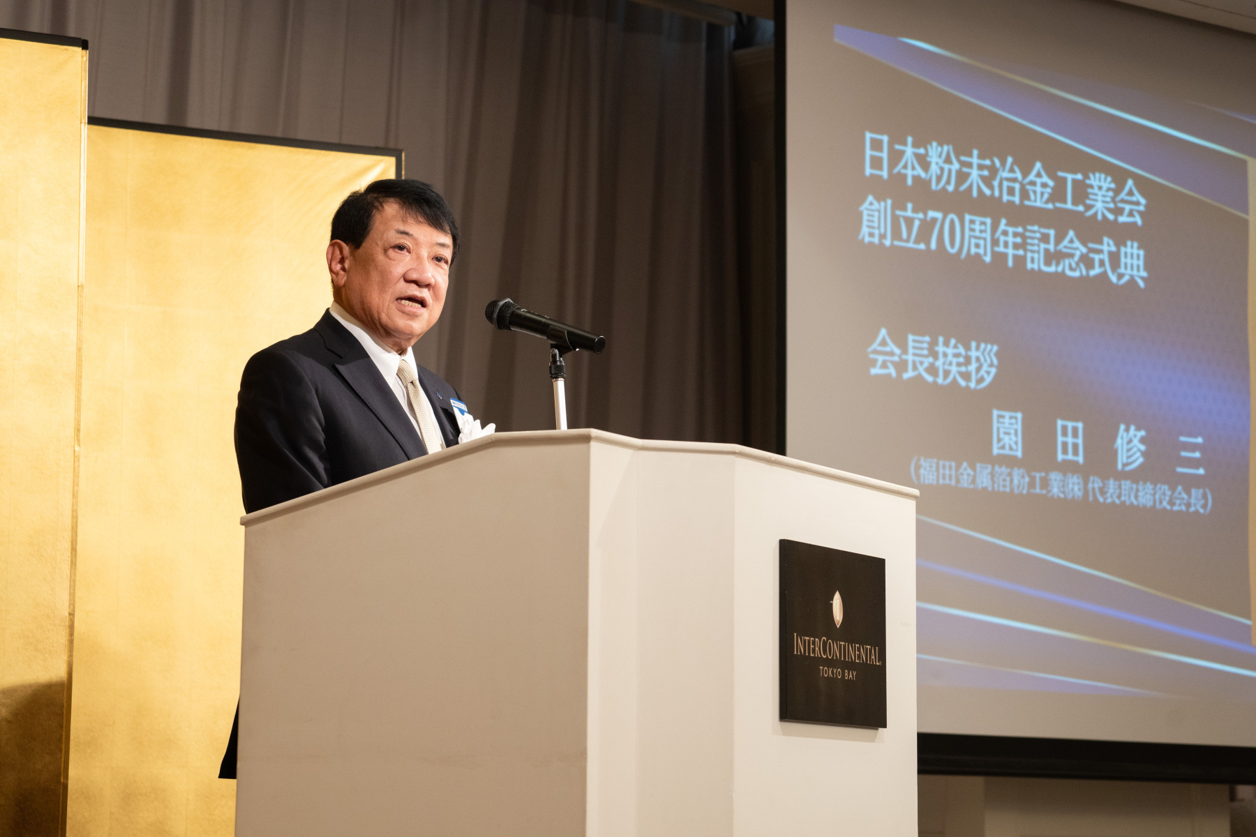 式典は、園田会長(福田金属箔粉工業株式会社)の挨拶で始まり、ご来賓の大今室長(経済産業省製造産業局素形材産業室)、海外友好団体(APMA(アジア粉末冶金連合)/EPMA(欧州粉末冶金工業会)/ MPIF(米国粉末冶金工業会))からビデオレターのご祝辞をいただきました。
